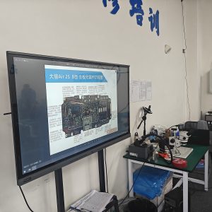 走进疆灵科技无人机维修培训教室,墙上“无人机维修培训”的蓝色大字醒目亮眼,大屏上清晰展示着大疆Air 2S主板元器件功能图,防静电工作台上显微镜、维修工具整齐排布,一场干货满满的实训课程正在这里火热开展。